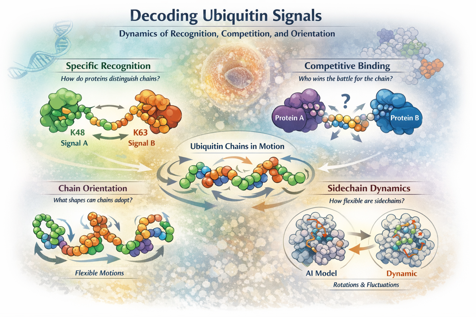 We investigate how conformational dynamics, transient states, and time-dependent recognition enable proteins to distinguish one ubiquitin chain from another. Static structures give us snapshots—but the real story unfolds in motion.
